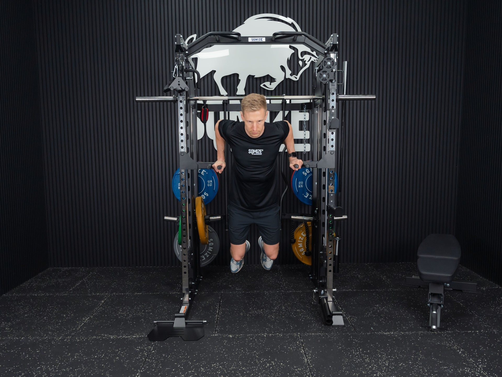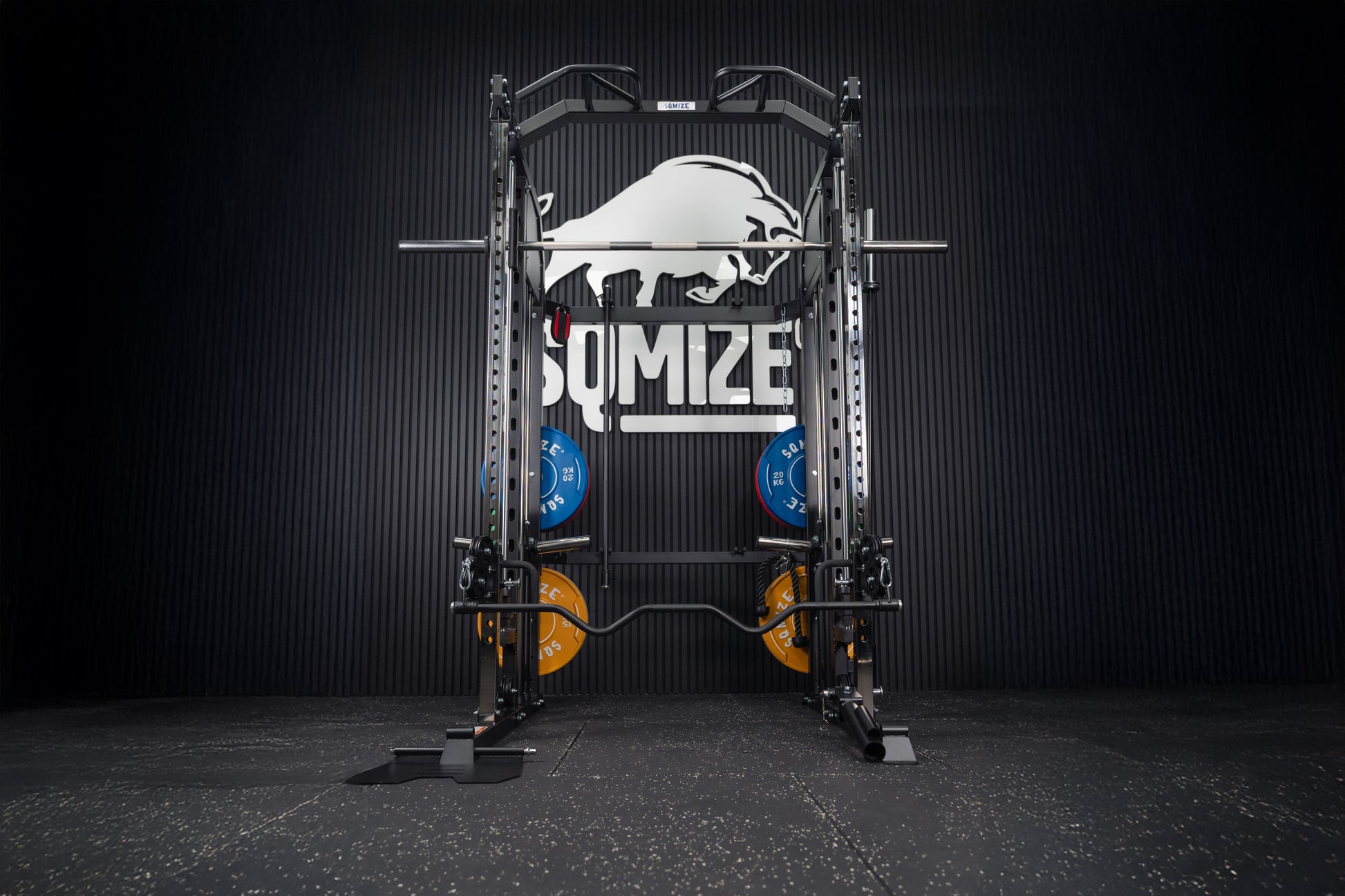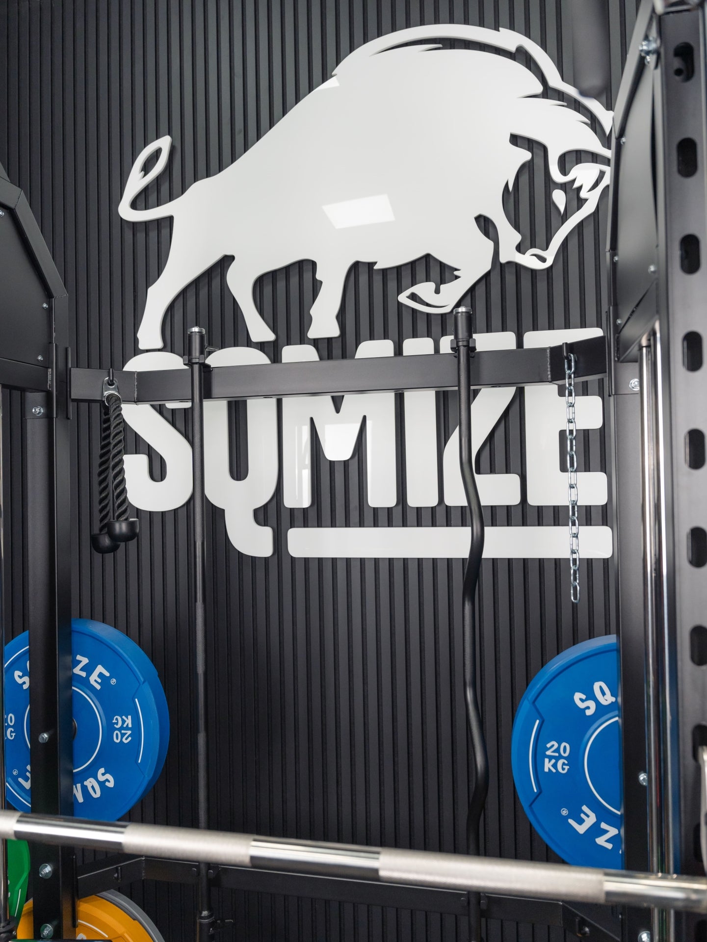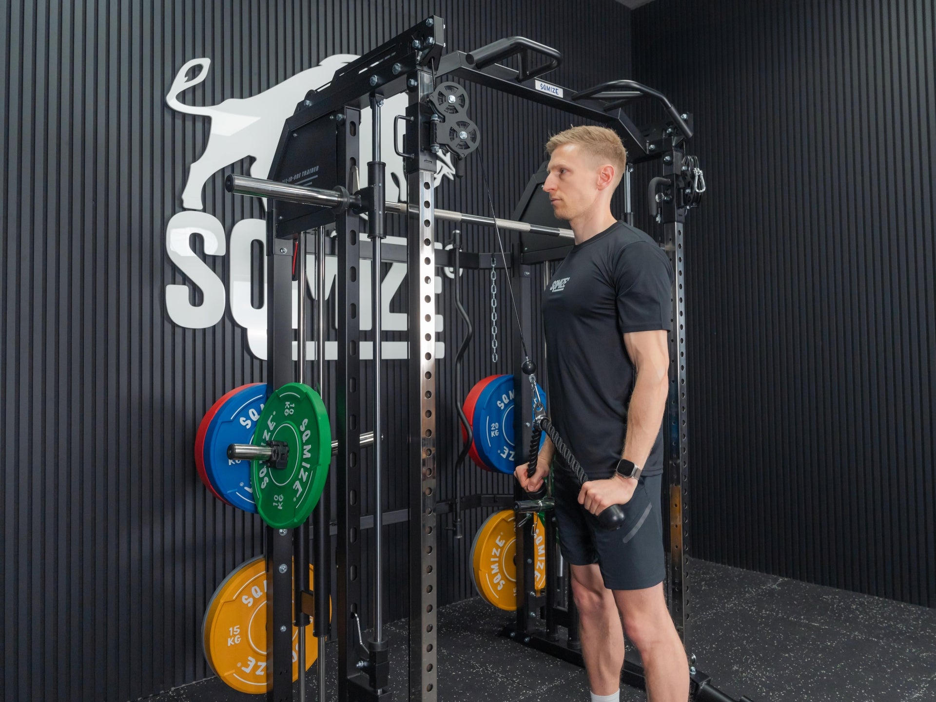 Mit der Premium Tri-Power Kraftstation SQMIZE® ELITE CLUB S899 XTR stellen wir den kleinen Bruder der Monster Power Gym All-in-One SQMIZE® PREMIUM BISON SQ-S991 vor. Bei dieser Kombination von Smith Machine mit Half Rack und Functional Trainer spürt man sofort, dass bei den Ingenieuren die höchste Workout-Kultur im Mittelpunkt der Entwicklung stand. Design, High-Quality Komponenten und Verarbeitungsqualität sind bei dieser Kraftstation daher einzigartig. Die hohe Wertigkeit dieser Kraftmaschine drückt sich in einer Vielzahl von exzellenten Lösungen und Materialien aus. Diese kompakte All-in-One Maschine ist als Gesamtlösung und im Detail außergewöhnlich. Ihr Arsenal an Zubehör, was im Lieferumfang eingeschlossen ist, beeindruckt. Der Athlet trainiert auf Studioniveau. Die Stellfläche beträgt 3 qm.