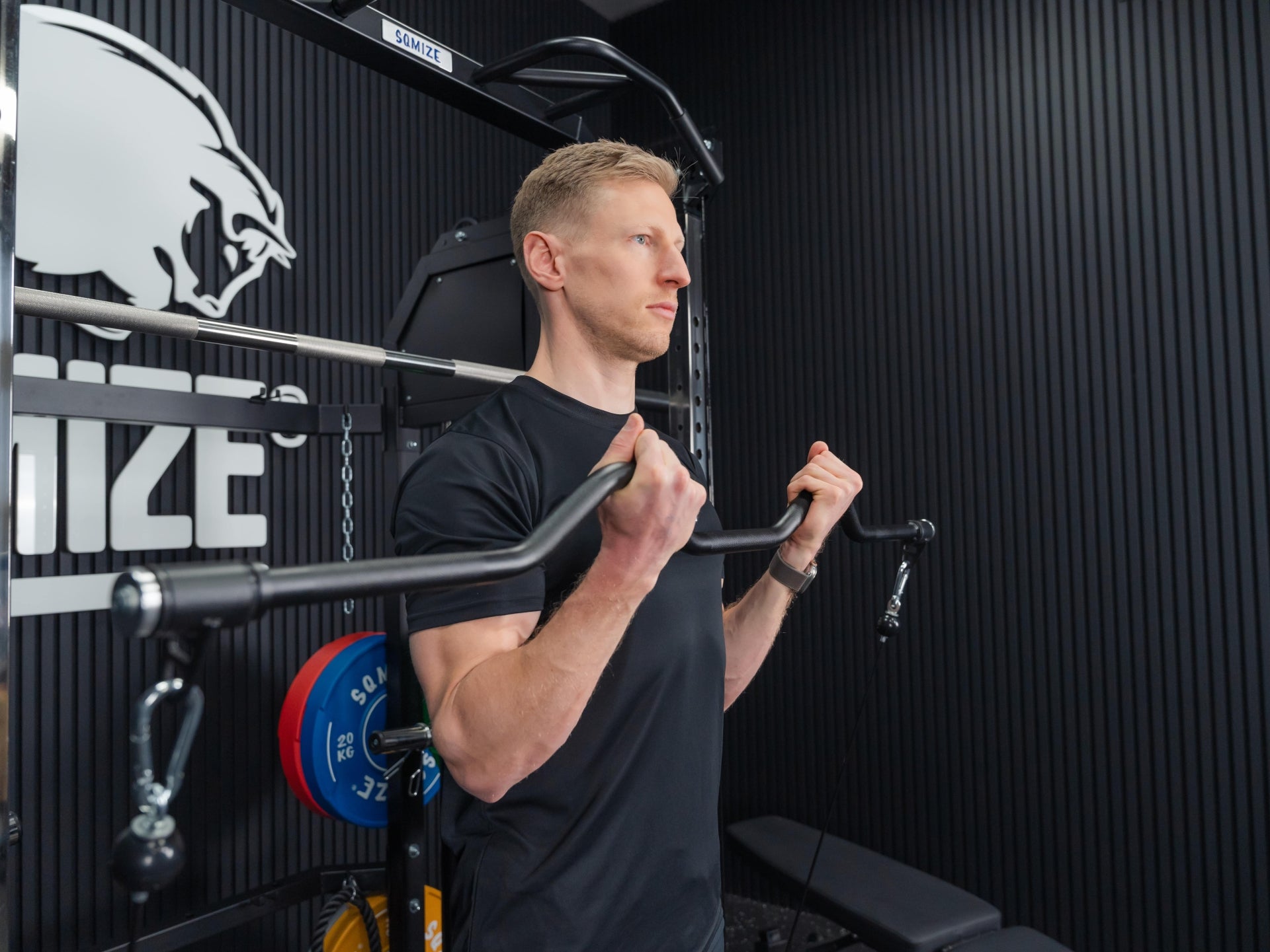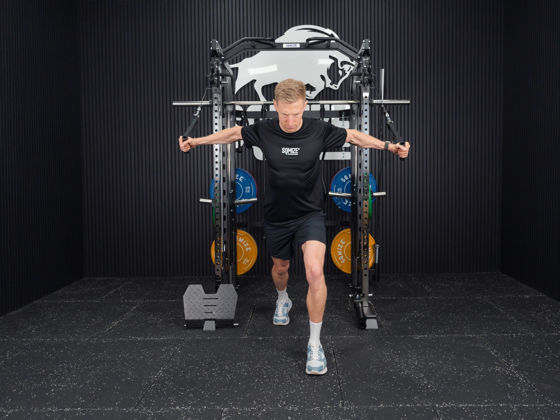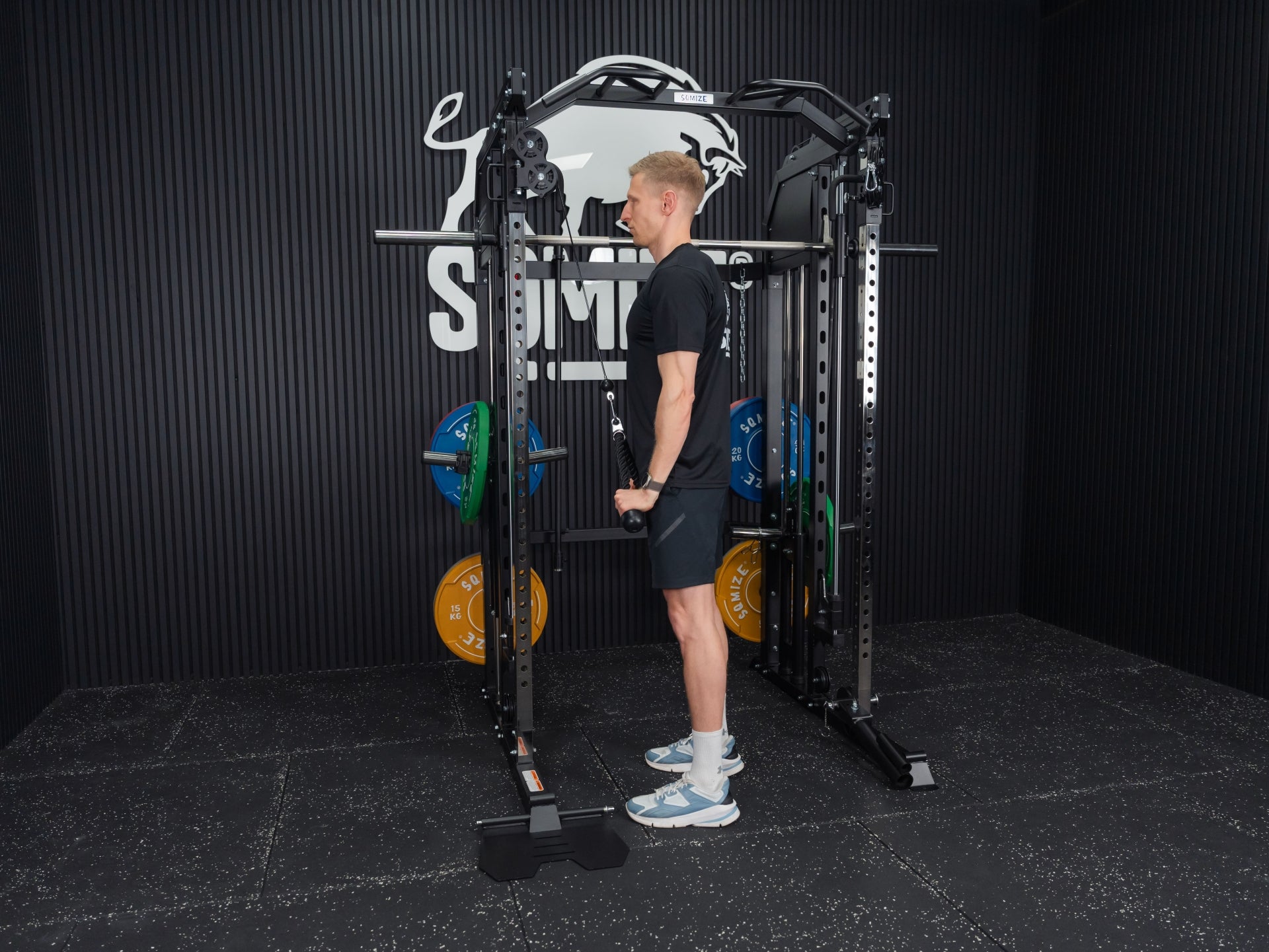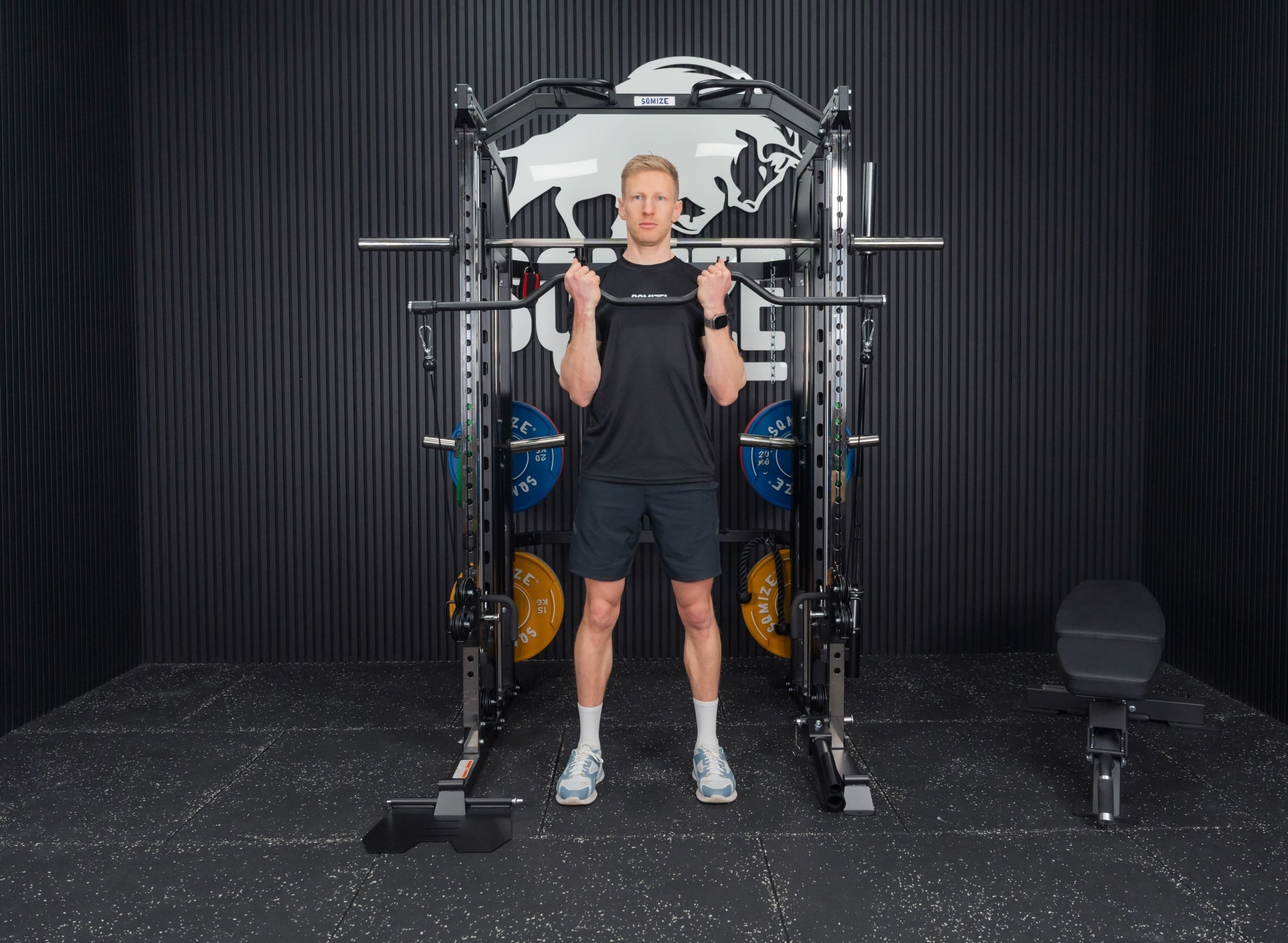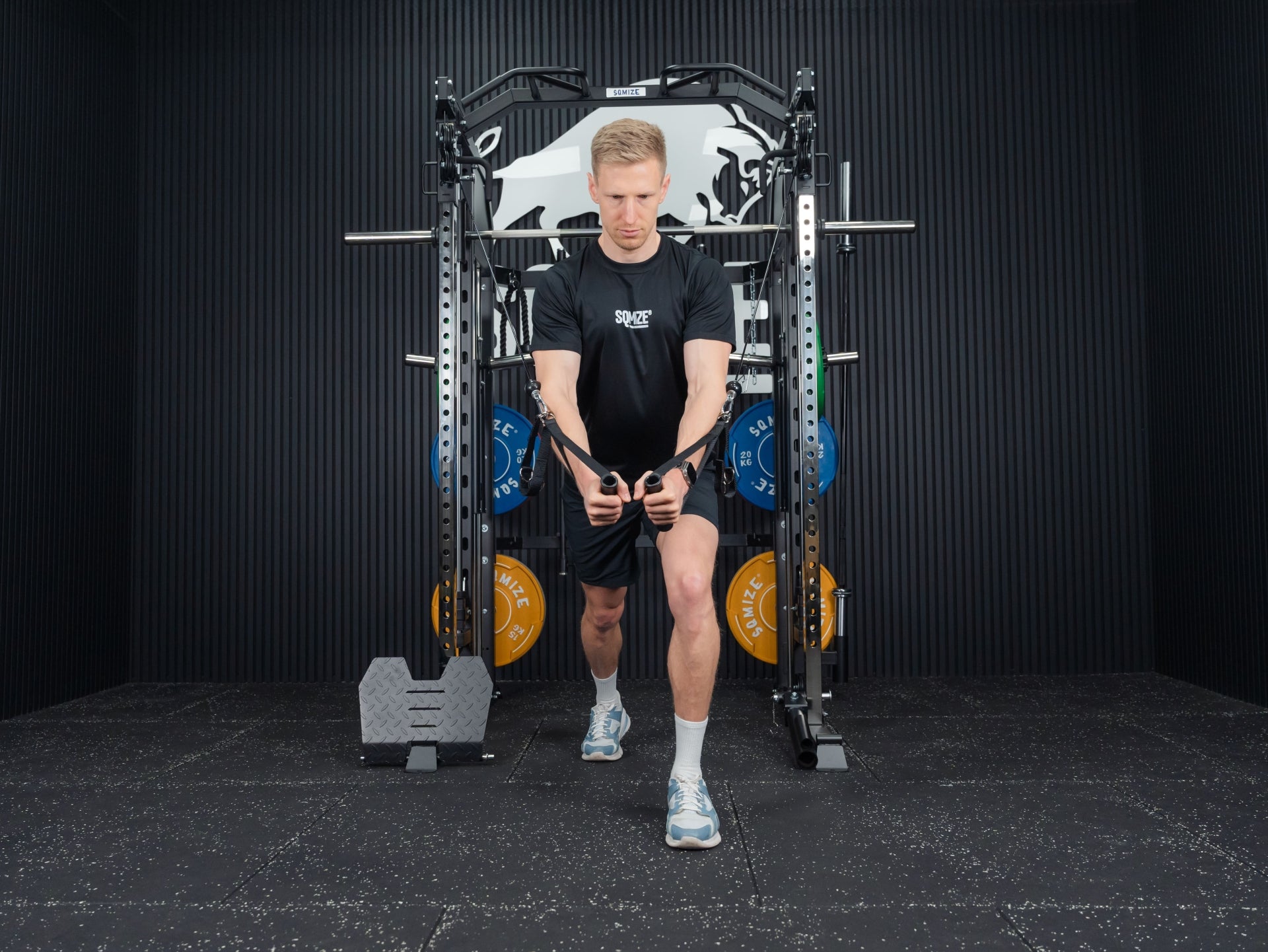 Mit der Premium Tri-Power Kraftstation SQMIZE® ELITE CLUB S899 XTR stellen wir den kleinen Bruder der Monster Power Gym All-in-One SQMIZE® PREMIUM BISON SQ-S991 vor. Bei dieser Kombination von Smith Machine mit Half Rack und Functional Trainer spürt man sofort, dass bei den Ingenieuren die höchste Workout-Kultur im Mittelpunkt der Entwicklung stand. Design, High-Quality Komponenten und Verarbeitungsqualität sind bei dieser Kraftstation daher einzigartig. Die hohe Wertigkeit dieser Kraftmaschine drückt sich in einer Vielzahl von exzellenten Lösungen und Materialien aus. Diese kompakte All-in-One Maschine ist als Gesamtlösung und im Detail außergewöhnlich. Ihr Arsenal an Zubehör, was im Lieferumfang eingeschlossen ist, beeindruckt. Der Athlet trainiert auf Studioniveau. Die Stellfläche beträgt 3 qm.